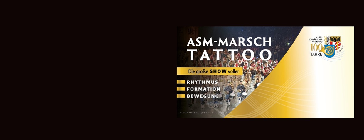 Wenn Blasmusik marschiert, wenn jeder Schritt sitzt und Klang, Disziplin und Leidenschaft eine Einheit bilden, dann ist es Zeit für das ASM-Marsch Tattoo 2026. Anlässlich des 100-jährigen Jubiläums des Allgäu-Schwäbischen Musikbundes erlebt Kaufbeuren am Samstag, 18. Juli 2026 in der energie schwaben arena ein eindrucksvolles Blasmusik-Großereignis, wie es unsere Region nur selten sieht.