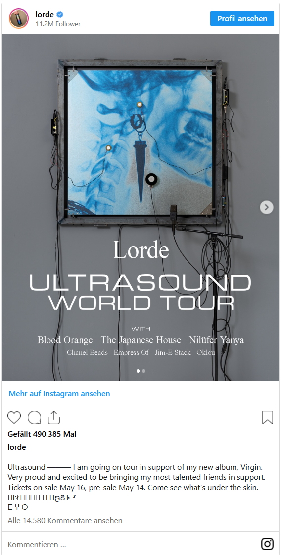 Jetzt geht’s Schlag auf Schlag: Kurz nachdem sich Lorde mit ihrer neuen Single „What Was That“ und einer Albumankündigung („Virgin“ wird am 27. Juni erscheinen) zurückgemeldet hatte, folgt jetzt auch eine Tourankündigung. Die Konzerte auf der ganzen Welt werden unter dem Motto „Ultrasound“ – passend zum Artwork des Albums – laufen. Und eben dieses neue Album wird dann auch im Mittelpunkt stehen, wie sie in ihrem Insta-Posting zur Ankündigung verrät.